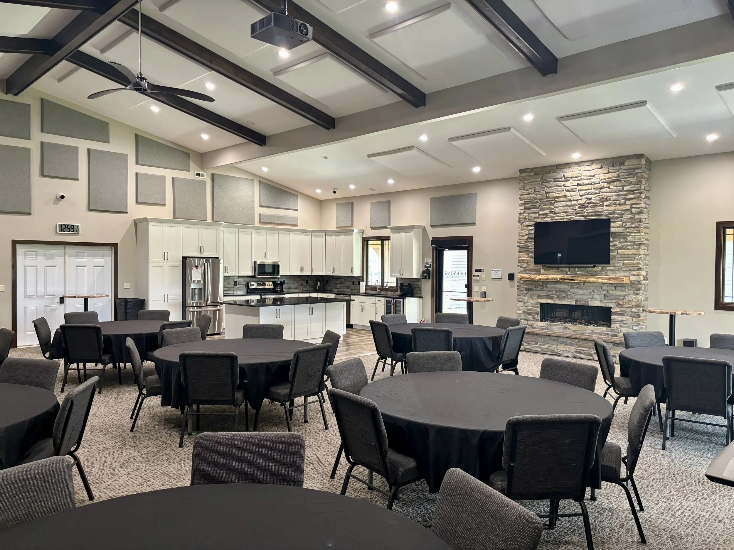 Ideal for weddings, galas, and formal dinners, the banquet setup uses round and/or rectangular tables that typically seat 6-8 guests each. With 10–11 tables, you can accommodate 60- 80 guests. This layout allows for a balanced combination of dining and conversation. It’s also a popular choice for seated luncheons and evening receptions.